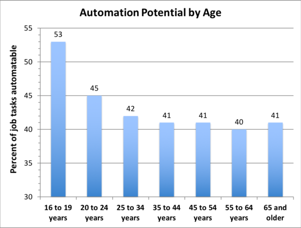 Automation potential represents the percentage of job tasks being done by workers in each category that could be automated. The youngest workers, who are more likely to be performing routine tasks, are hardest hit by automation. Numbers reflect the percentage of job tasks that are automatable; the percentage of entire jobs eliminated would be much lower.