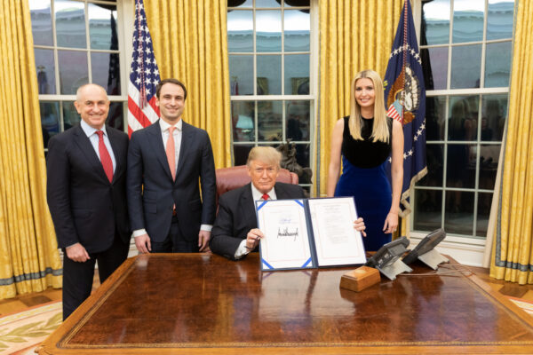 Quantum science and technology became a national priority during the first trump administration. In 2018, a Republican-led Congress passed the National Quantum Initiative Act (NQIA) with broad bipartisan support, and a bipartisan group of lawmakers is leading its reauthorization in 2026. Here President Donald Trump signs the original NQIA into law in December of 2018. By his side is Michael Kratsios, then deputy assistant to the president for technology policy and current director of the Office of Science and Technology Policy, who in 2025 identified supply chains and enabling technology as one of five priorities for the current administration’s quantum strategy. (White House Office of Science and Technology Policy)
