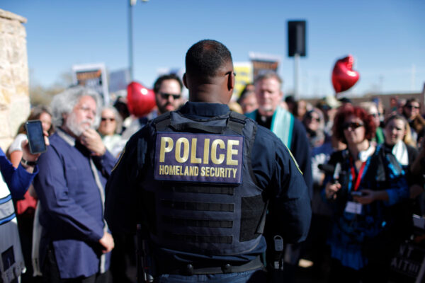 A DHS security officer secures a protest at the Tornillo port of entry. (IPA)