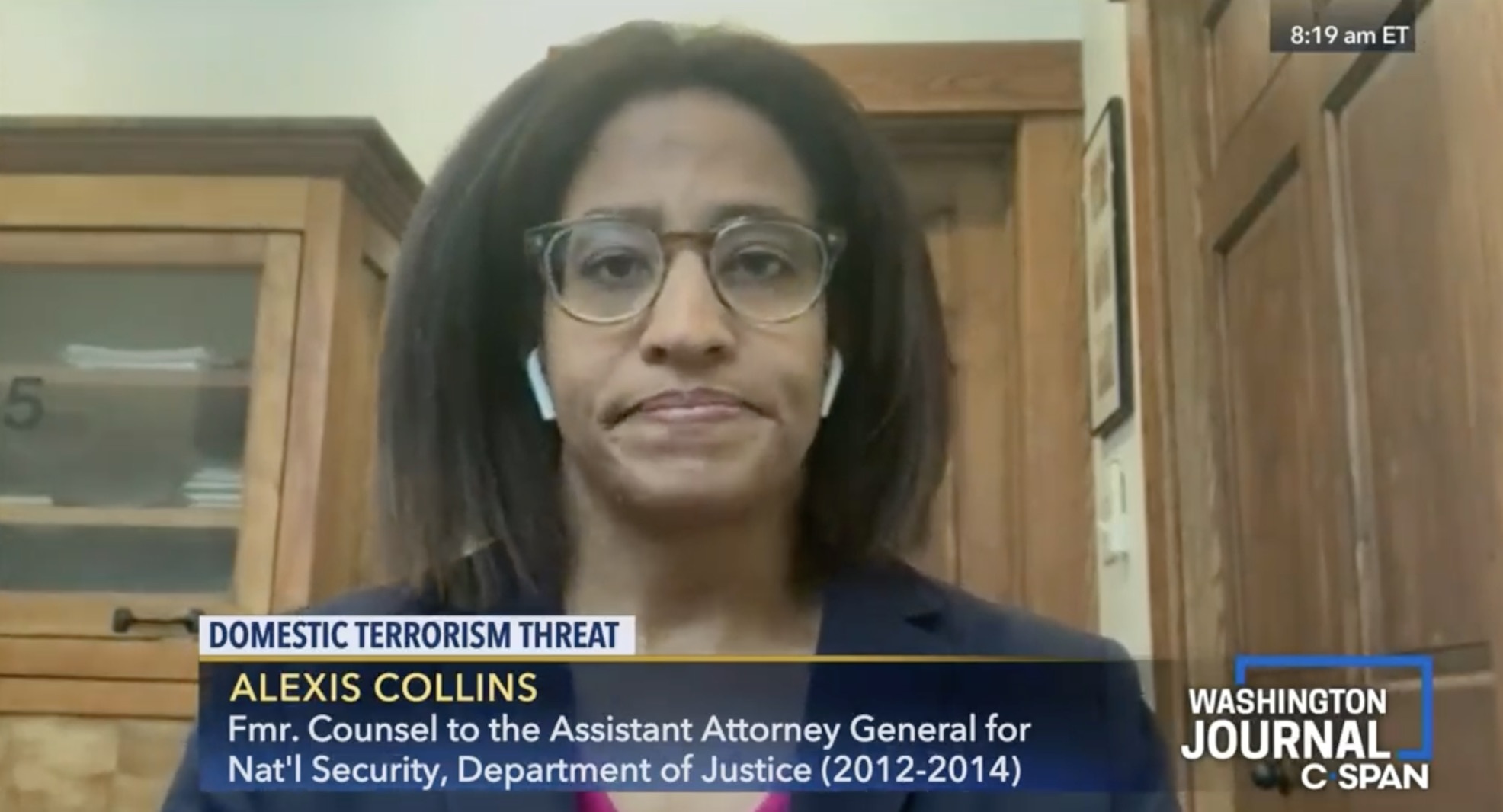 Alexis Collins discusses the heightened domestic terrorism threat in the U.S. with The Washington Journal on C-SPAN.